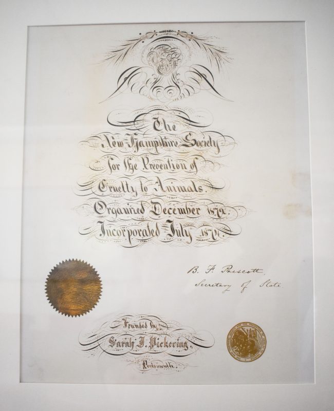 One Hundred and Forty plus years ago, a group of concerned citizens recognized that work animals were being treated inhumanely and unjustly. Following in the footsteps the New Hampshire State Legislature which enacted humane laws to protect “dumb animals”, the Portsmouth Society to Prevent Cruelty to Animals was formed in 1872. The organization was incorporated and the following year the name was changed to the New Hampshire Society for the Prevention of Cruelty to Animals—one of the first ten such societies established in the United States.