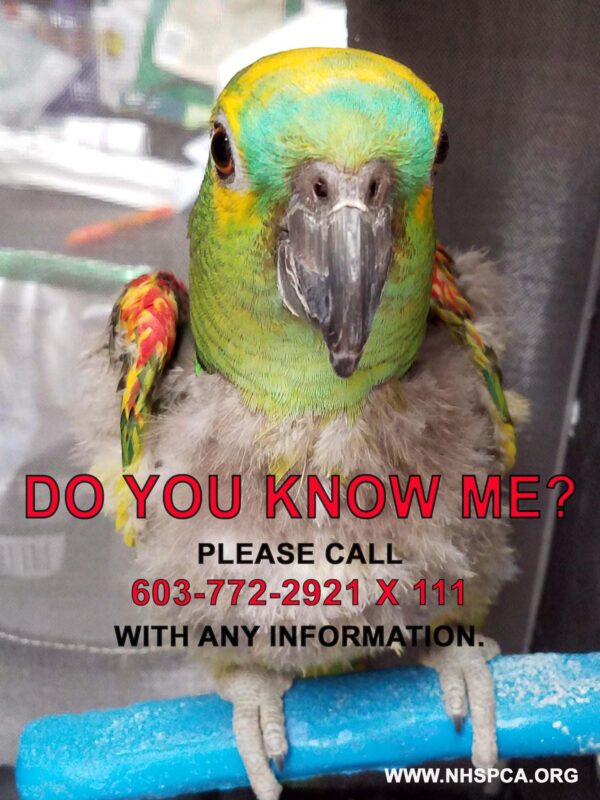If you think you know this bird, the New Hampshire SPCA is very interested in any information you may have. Please contact the NHSPCA directly at 603-772-2921 x 111.