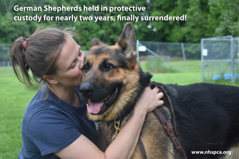 On Wednesday, October 2, 2019, the New Hampshire SPCA received a signed surrender form finally releasing 28 German Shepherds from Protective Custody and giving them a chance to find loving forever homes. The Shepherds have been held at the New Hampshire SPCA for 22 months awaiting the trial, and then the retrial of their owner on cruelty charges.