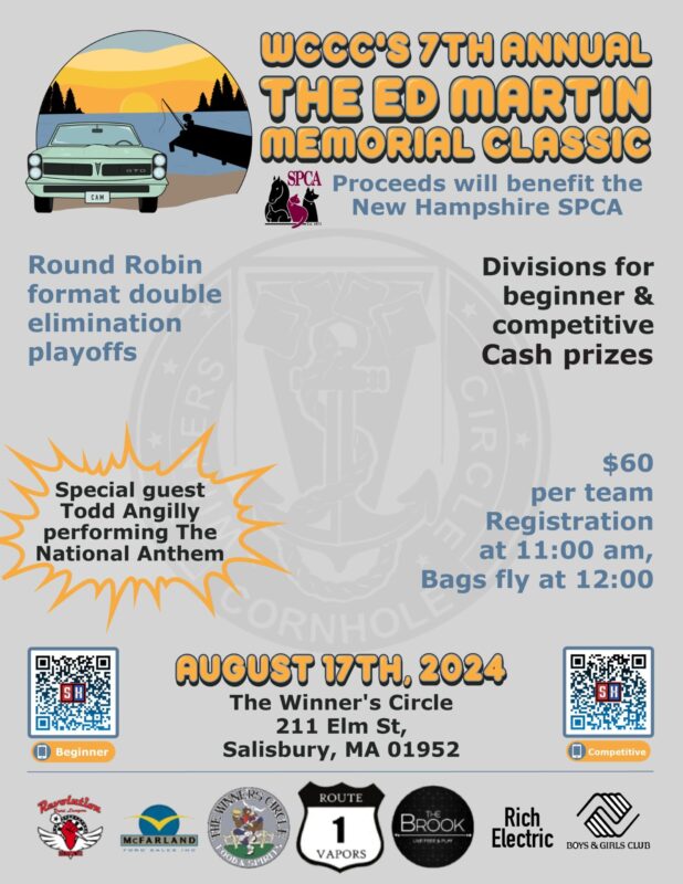 Do you love cornhole and animals? Then join our friends at the Winner’s Circle in Salisbury, MA for their 7th Annual cornhole tournament, The Ed Martin Memorial Classic. Proceeds will benefit the New Hampshire SPCA!