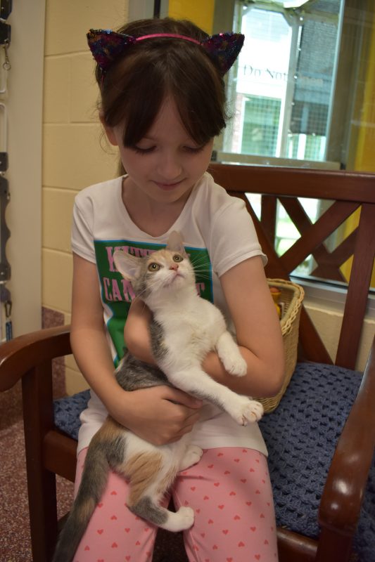 Molly’s family adopted Lovey, a three legged cat last year at our Clear The Shelter Event. See her special interview with NBC Boston’s Katherine Underwood. Molly and her parents came back this year to add a kitten to their family! Molly was prepared to wait in line, sporting a specially designed t-shirt that said, “Kitten Campout 2018” . She is pictured above with her new Kitten, she named Sugar.