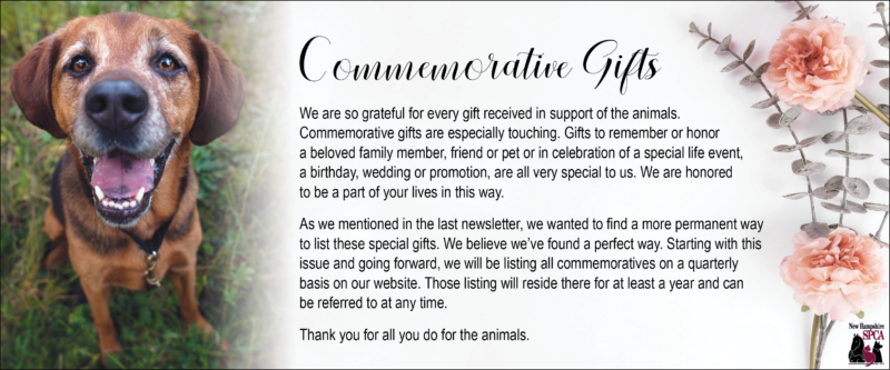 Commemorative gifts listed below were received by the New Hampshire SPCA