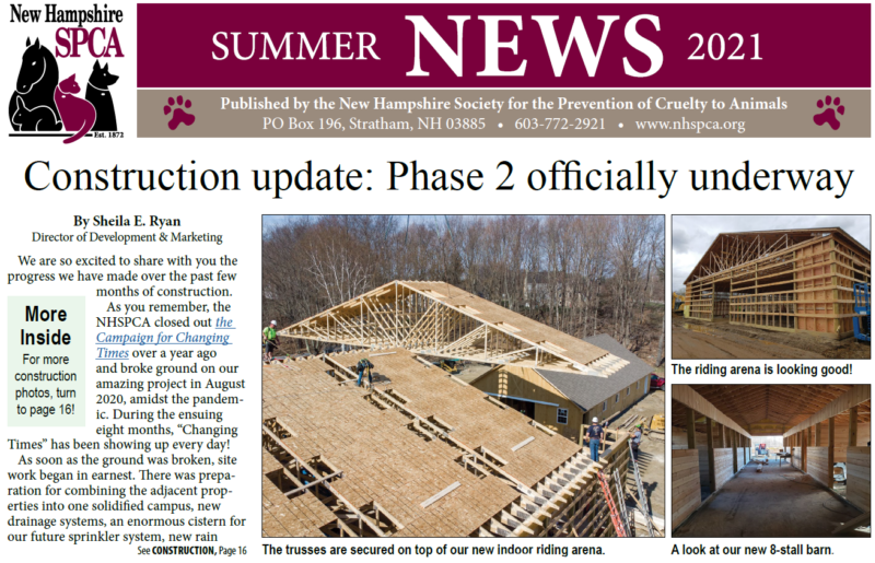 We miss the interaction with our community and look forward to the day we swing the doors back open and invite everyone to see what we have been working towards. Until then, the New Hampshire SPCA remains an active construction zone, and access to the facility needs to be controlled for safety. By appointment, we continue our work. Animals in need of a safe place can still be surrendered, and most of the steps for adoption can be done over the phone or online. We have resumed vaccination clinics, and training classes are held both indoors and out. We are excited to invite campers back in person this summer. With the addition of a second classroom, social distancing and smaller groups will ensure everyone’s safety. Working space has been very limited during renovation, and so we have only minimal room for storage. It is heartbreaking to turn away donations of blankets, toys, and beds, but we cannot store them at this time and appreciate folks refraining from leaving them outside our door.