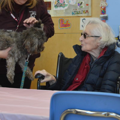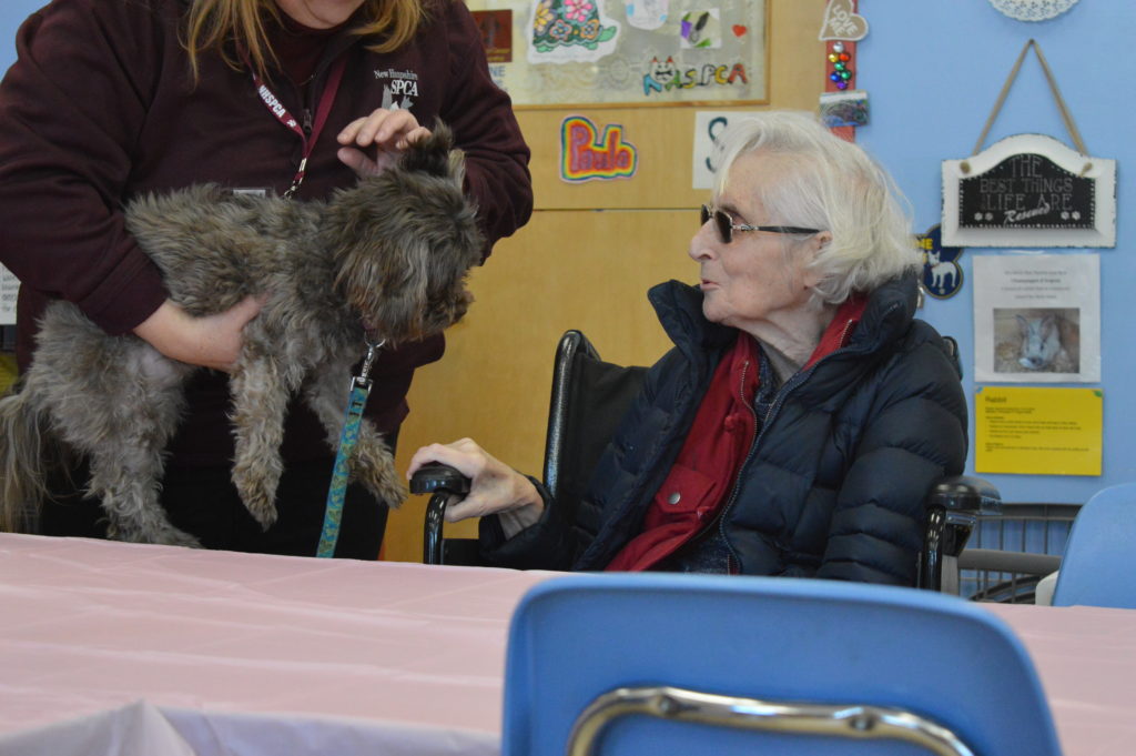 Held at libraries, museums and other community oriented settings, Alzheimer’s and Memory Cafés are now common options for people to attend on a regular basis! Incorporating an Alzheimer’s Café into the regular program offerings at the NHSPCA seemed only natural to our Manager of Humane Education, Paula Parisi. She and I collaborated for the last several months to make her dream of offering an Alzheimer’s Café a reality. We thought that the classroom here at the shelter was the perfect place to hold our own Café. As a community organization, we aim to not only be a place for those looking to adopt, but also a place of assistance, information and community for all. Usually home to birthday parties, camps, school groups and Junior Volunteer meetings, the classroom is in fact the perfect space for a Café with room to gather and learn about the shelter and all the animals in our care.