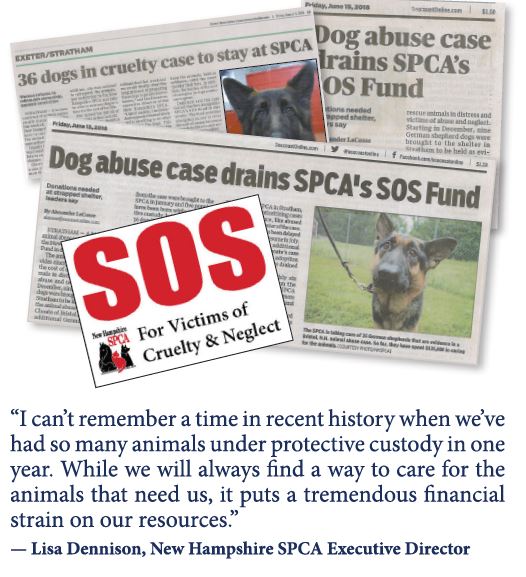 Our most infamous case this year has been the 36 German Shepherds rescued from severe neglect. It began on Dec. 13, 2017, nearly a year ago, when the first 9 Shepherds were rescued after a negligent fire in Bristol, NH killed 29 other dogs. The remaining 9 were trapped in the burned out basement. Just 20 days later, another 22 Shepherds were rescued from the same owner who was holding the dogs in the loft of a barn. It was -11 degrees inside the barn when we took the dogs from their wire crates, shaking and hungry. The only water or food to be found was frozen solid. Then in February, one of the dogs added 5 newborn puppies to the collection, bringing the total to 36 German Shepherds in our care.