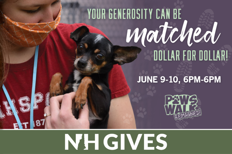 Are you ready to be a part of #NHGives? It’s a day to celebrate all the good going on in our communities! Thanks to a generous matching gift from the NH Charitable Foundation, if you make a gift to our Paws Walk Reimagined virtual fundraiser your donation could be matched dollar -fur-dollar!