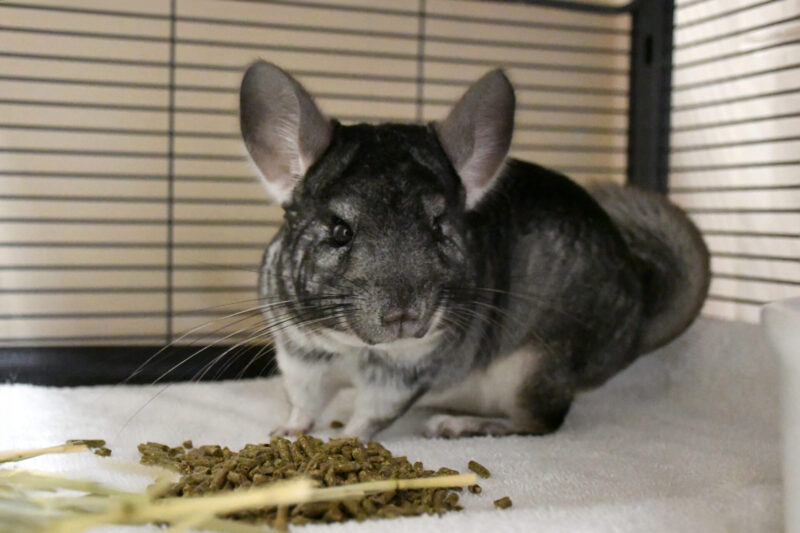 Jazmine stays active by running through tunnels and up and down the ramps in her enclosure. She enjoys nibbling on wooden chew toys and will sometimes get a little gossipy and tell you about her day. While chinchillas are more on the independent side, she will appreciate gentle interaction and with some time and patience, could even grow to enjoy sitting with you.