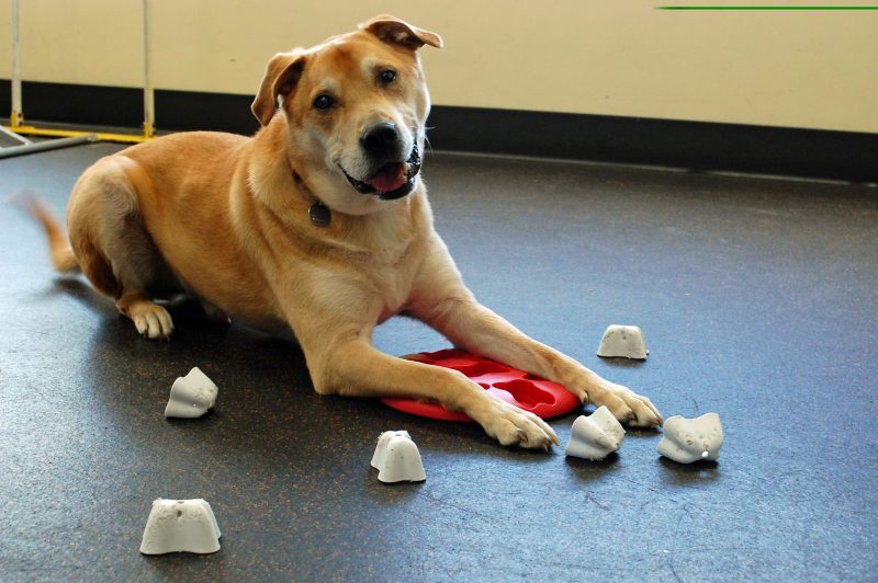 This program is designed to stimulate the dogs’ senses and natural instincts while in the shelter environment. Similar programs have been used all over the world to make shelter life for dogs more comfortable and aid in their speedy adoptions. The kennel walls are sprayed with a different scent each day to stimulate their olfactory senses. Each day a different sound will be played in the CD player to stimulate their auditory senses. Sometimes it will be the sound of rain falling in the forest, birds calling, or even some classical Mozart! Dog toys are rotated each day as well so that each dog will experiences something new to interact with, at least on a daily basis. This is an effort to introduce novelty into their environment and keep them thinking. After all, you can only get excited about a slobber filled tennis ball so long. In addition; for one meal each day the dogs will be fed out of different feeding dispensers in order to trigger their natural scavenger instincts, to work for food. Food dispensers can range from a rubber KONG toy, doggie TV dinners (their normal meal frozen in a cube of ice along with treats and toys), or even kibble in a crumpled up paper bag or cereal box with holes. The dogs use their natural instincts to toss, turn, shred, or paw at the food inside the dispensers helping them satisfy their natural drive. They are, in essence, hunting! Meal times become an opportunity for mental exercise as well as satisfying an appetite.