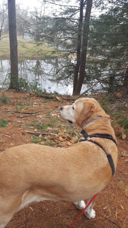 “Bentley, adopted at the New Hampshire SPCA 8 years ago, has been my life saver during such stressful and uncertain times. He is recovering from ACL surgery and needs walks, increasing in length, 3 times per day. We have been out every day, no matter the weather, since the beginning of February. This spot in the picture is walking distance from our house. It’s a small, beautiful spot teeming with natural beauty. We sit over the pond meditating, praying, listening to all kinds of birds, watching the carp swim, and the newly arrived blue heron. Sitting with Mother Nature and Bentley helps me remember that all is right with the earth, and that Mother Nature will always find a way.